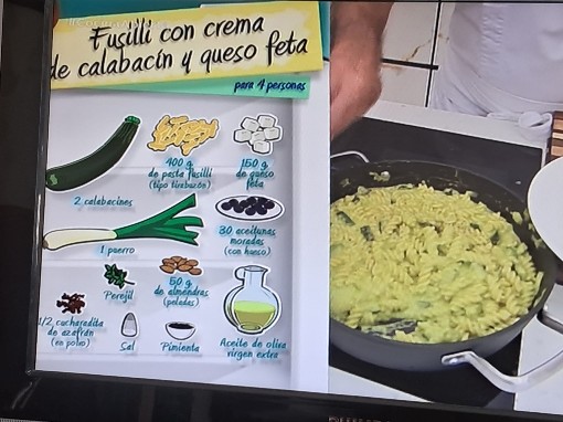 Ingredientes 400 g. espirales de pasta Elaboración Se pochan los dos calabacines troceados en daditos con piel, se añade el puerro picado añadir 2 o 3 cucharadas de agua Cocer la pasta en el agua hirviendo con sal, 9 minutos para que quede a dente. Salsa: La mitad del calabacín se echa en la batidora con un pelín de Azafran disuelto en un vaso de agua, y se añaden unas almendras y un paquete de queso feta y se bate. Escurrir las pasta cocida y mezclarla con el calabacín de la sartén pochado y con las salsa de la batidora dejarlo en las sarten 2 minutos Poner en el plato encima de la pasta un poquito de pimienta molida almendras picadas aceitunas moradas y queso feta desmigado con los dedos |
