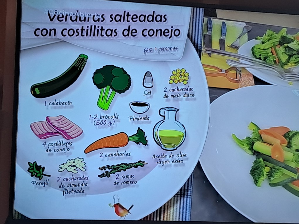 Verduras salteadas con costillas de conejoLimpia y trocea toda la verdura. En una cacerola amplia con agua, a fuego medio, cuece toda la verdura durante un minuto desde que empiece a hervir. Sácalas y despuĂ©s las metes en agua muy frĂa. Escurre y saltea despuĂ©s en una sartĂ©n con un chorro de aceite y una ramita de romero. Tuesta los trozos de almendra en una sartĂ©n sin aceite. En otra sartĂ©n, dora los trozos de carne, salpimentados previamente, con un chorro de aceite a fuego fuerte. |