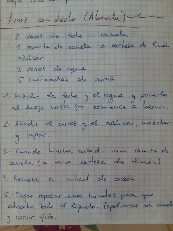 Raciones: 8 raciones Tiempo de Preparación: 25 min Tiempo Total: 25 min + reposo Ingredientes 10 o 20 g de piel amarilla de un limón gordo 500 g de agua 200 g de arroz normal un pizco de sal 600 g de leche caliente 1 palito de canela en rama (de unos 5 cm de largo) 180 g de azúcar canela en polvo para espolvorear Elaboración 1) Poner a hervir la piel de limón, el agua, el arroz y la sal. Mientras se va haciendo (unos 10 minutos) revolvemos continuamente. 2) Añadir ahora la leche, que se habrá calentado previamente (por ejemplo en el microondas, junto al palito de canela, a potencia máxima , de manera que se caliente pero no hierva) y se deja unos 4 o 5 minutos mientas se revuelve. 3) Una vez pasados los cuatro minutos, añadir el azúcar y remover sobre el fuego otro par de minutos. Estos dos minutos podrían ser 3 o 4, según el tipo de arroz y de si se quiere más o menos entero. Por ello lo mejor es ir añadiendo de 1 en 1 minuto, probándolo cada vez hasta que esté a nuestro gusto. Debe quedar blando y cremoso, pero no deshecho ni como papilla. 4) Volcarlo en una fuente amplia y dejar que se enfríe. Durante el enfriamiento embebe gran parte de la leche que le ha sobrado. Cuando esté totalmente frío, se espolvoreará con canela en polvo. Para conservarlo bien y que no se reseque, guardarlo siempre en la nevera cubriendo toda la fuente con lámina de plástico trasparente bien pegada.  |