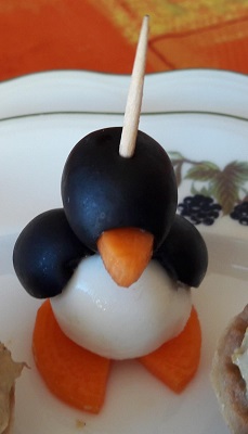 Elaboración Cortamos una rodaja muy finita de la zanahoria, y le hacemos una muesca en forma de triángulo. Eso serán las patas y el pico del pingüino. Luego cogemos dos aceitunas negras sin hueso. A una le ponemos el pico de zanahoria, y a la otra le metemos la bola de queso , de manera que quede abierta por la parte delantera. Ahora solo tenemos que ensartar con los pinchos de madera para brochetas que más os gusten la cabeza, el cuerpo y las patas. Es especialidad de Eva.